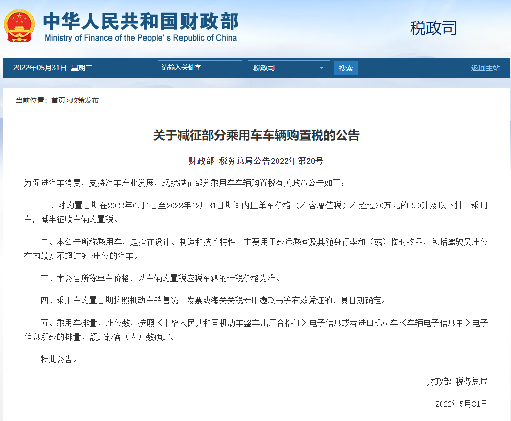 今天,财政部、税务总局正式公布了减征部分乘用车车辆购置税的有关政策。