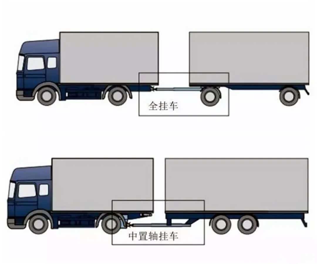 ①中置轴挂车车轴位于车身中间,得依靠支腿才能平稳站立;全挂车车轴位于车身前后两端,能独自站立。