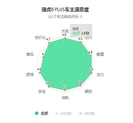 在瑞虎8PLUS车主满意度当中,245位车主综合评分达到了9分。其中外观4.6分,空间4.8分,配置4.8分,动力4.9分,操控4.6分,油耗4.5分,安全4.8分,舒适4.6分,售后4分,性价比4.7分,从这组数据可以看出车主对动力、空间、安全性非常认可,对售后方面不太满意,也是目前奇瑞的短板。