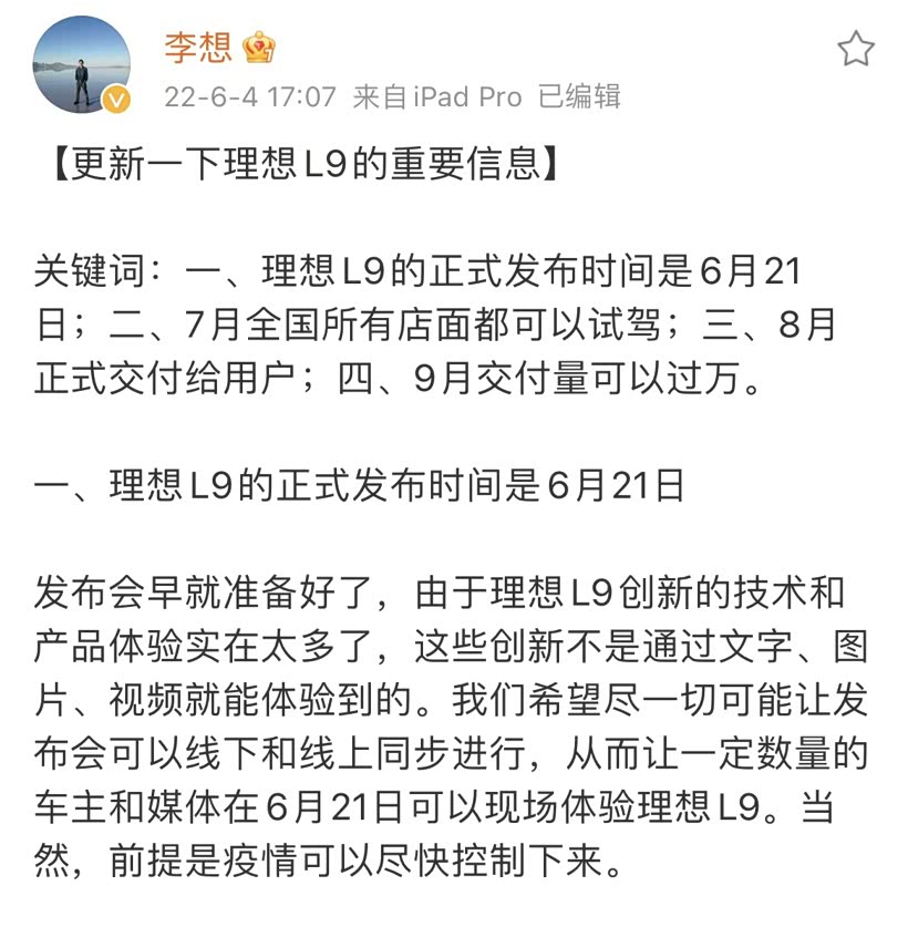 近日,理想汽车CEO李想在其个人社交媒体上公布了 理想L9(图片 | 参数 | 询价)的最新信息,其中提及新车将于6月21日正式发布,7月可到店试驾,8月将正式交付。李想还表示,在疫情控制下来的前提下,理想L9有信心9月实现过万的交付量。