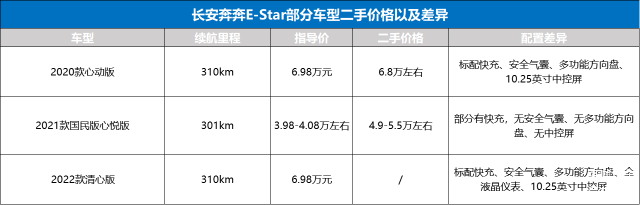 五菱 宏光MINIEV(图片 | 参数 | 询价)的爆火,一度刷新了汽车消费的门槛,更曾将低价微型车的价格拉到3万元内。为了争取更大的销量,长安奔奔E-Star不得不跟风推出一系列起步价只要2.98万元的2021款国民版车型。由于价格低廉且尺寸比多数同级产品更大,重点是4万元左右就能买到300km多的续航,因此国民版车型在其中可以说是很受欢迎。不过受芯片短缺等因素影响,长安新能源在2021年年末就停止了长安奔奔E-Star国民版等低价版本的订单。同时另外两款价格只要5万元出头,就有超300km续航的多彩版限量款车型也很快在今年停止接单。可以看到的是,长安奔奔 E-Star中极具性价比的几款国民版车型基本已经买不到了。预算有限但又想续航高一点,有不少小伙伴开始打起了二手车的主意。