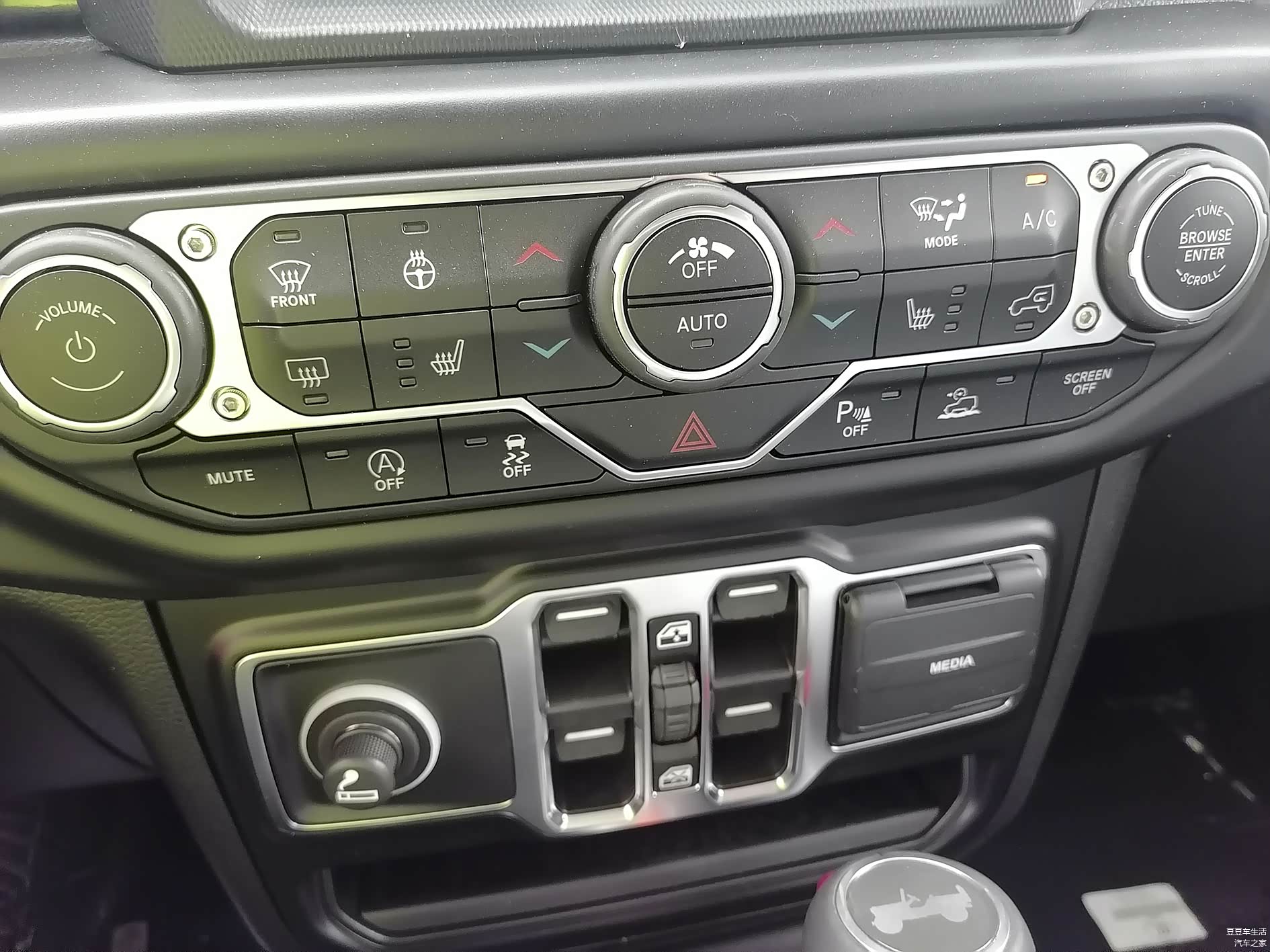 物理按键满满,很多功能都可以在中央显示屏上控制。不过中间这个物理按键区集中度很高。像方向盘加热、座椅加热、空调控制,发动机启停关闭等都在这里调节