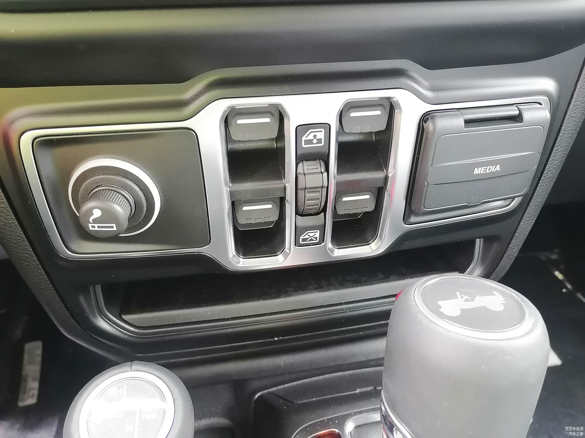因为车门可拆卸的原因,玻璃的控制按键放在这个位置。第一次开这个车的人可能要找一阵子了。