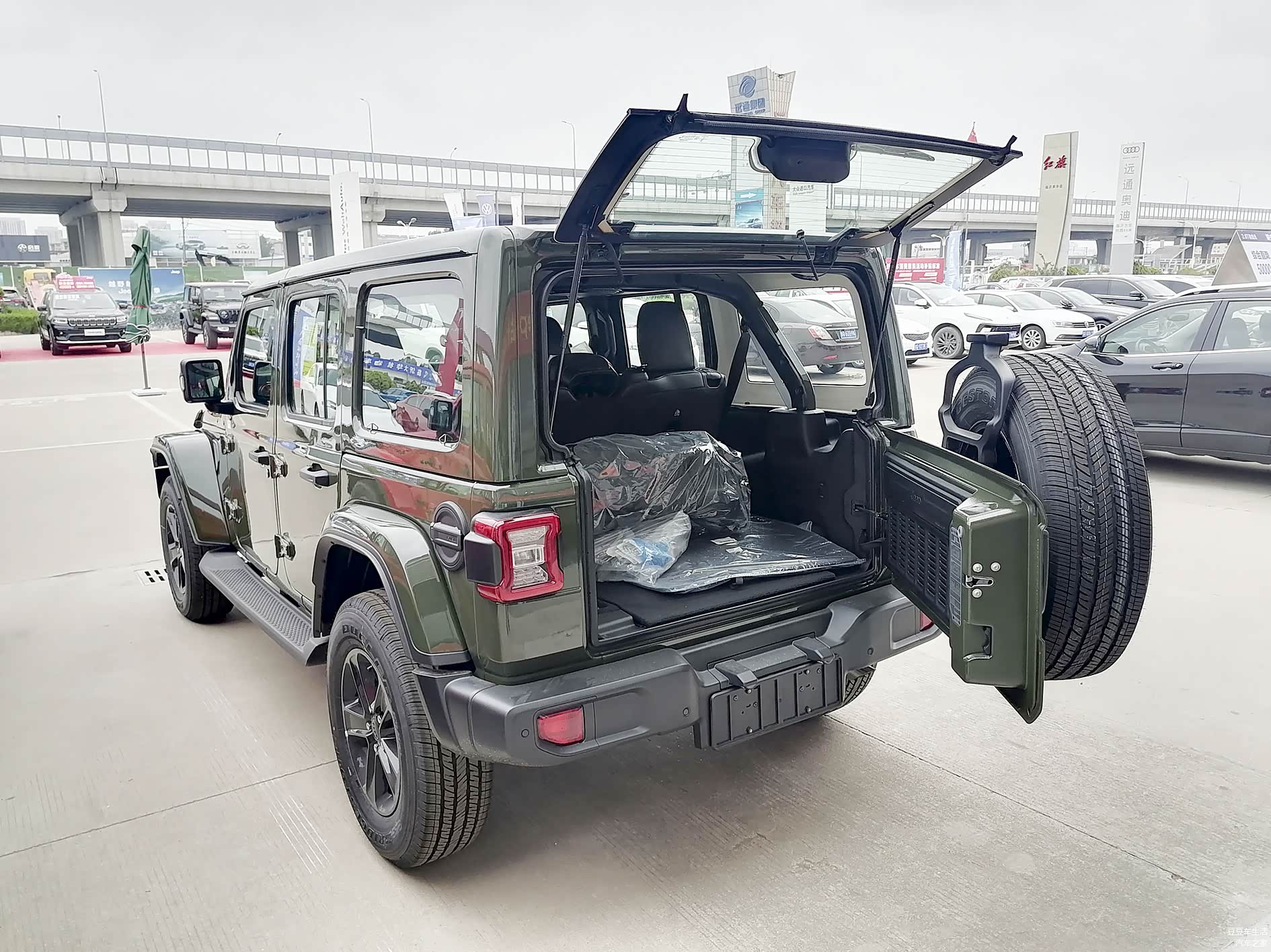 后尾门两级开启,后窗玻璃单独向上打开,备胎是向右边拉开。