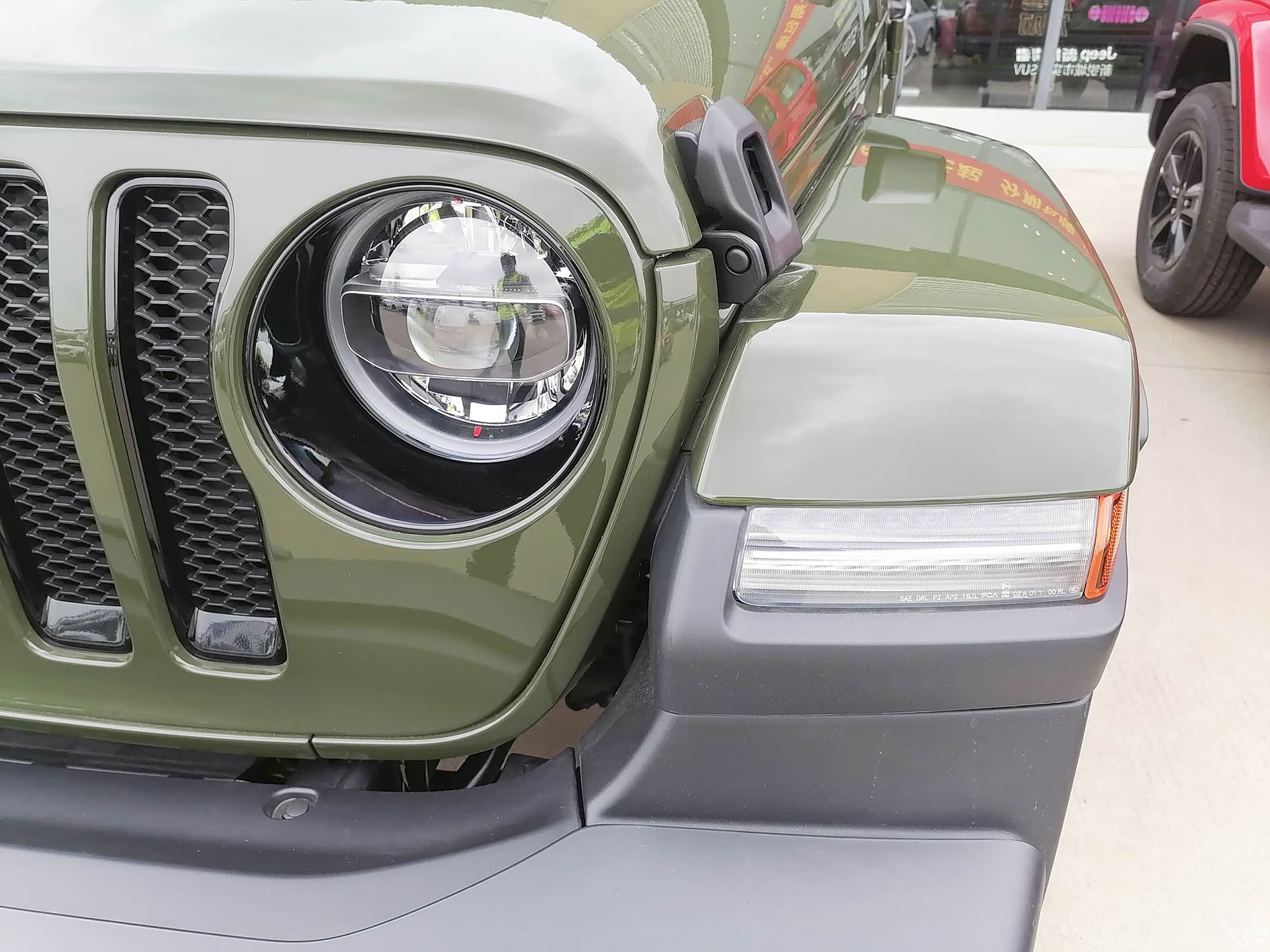 圆形的大灯带有LED远近光,这款丛林绿是在高地版基础上推出的新颜色车型,因此带有很多高地版的特征 如圆形大灯以及七孔内的黑色装饰、黑色的轮圈等都是高地版才带的配置。