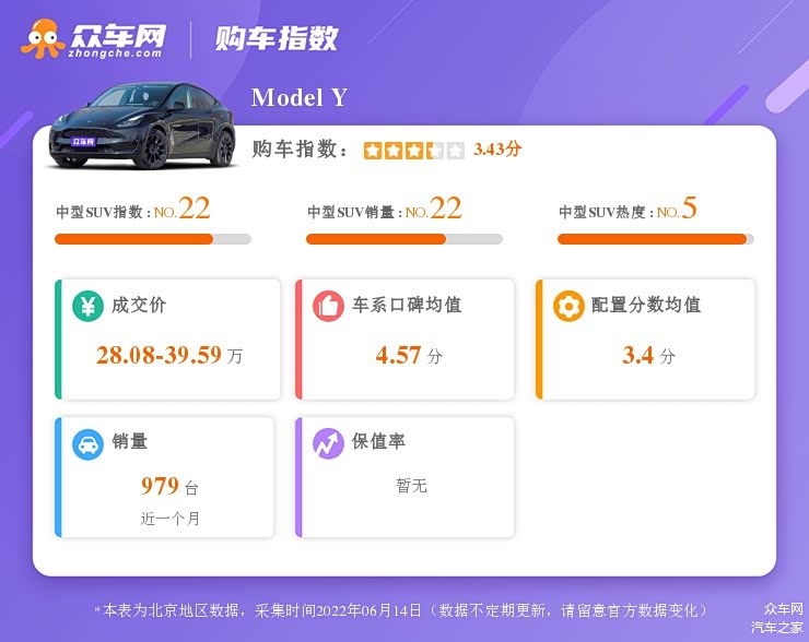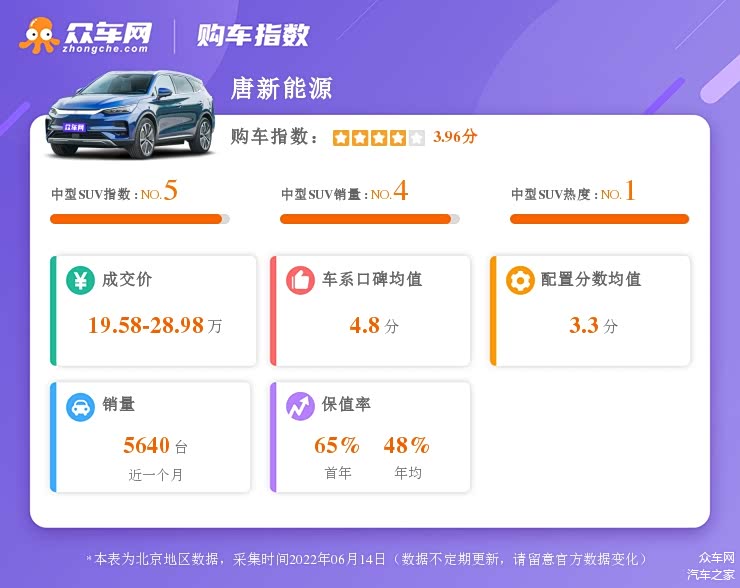 在同级别里就没有能和特斯拉Model Y抗衡的么?这里就要提到购车指数了,它是结合了消费者最关心的价格、销量、口碑、配置、保值率等关键因素,最终通过数据分析得出车型的综合评分。在最新的榜单中,比亚迪唐EV就是特斯拉Model Y最有力的竞争者。接下来,我们从动力、续航、空间、配置、价格进行对比,看看这两台热门车型各自都有什么亮点。