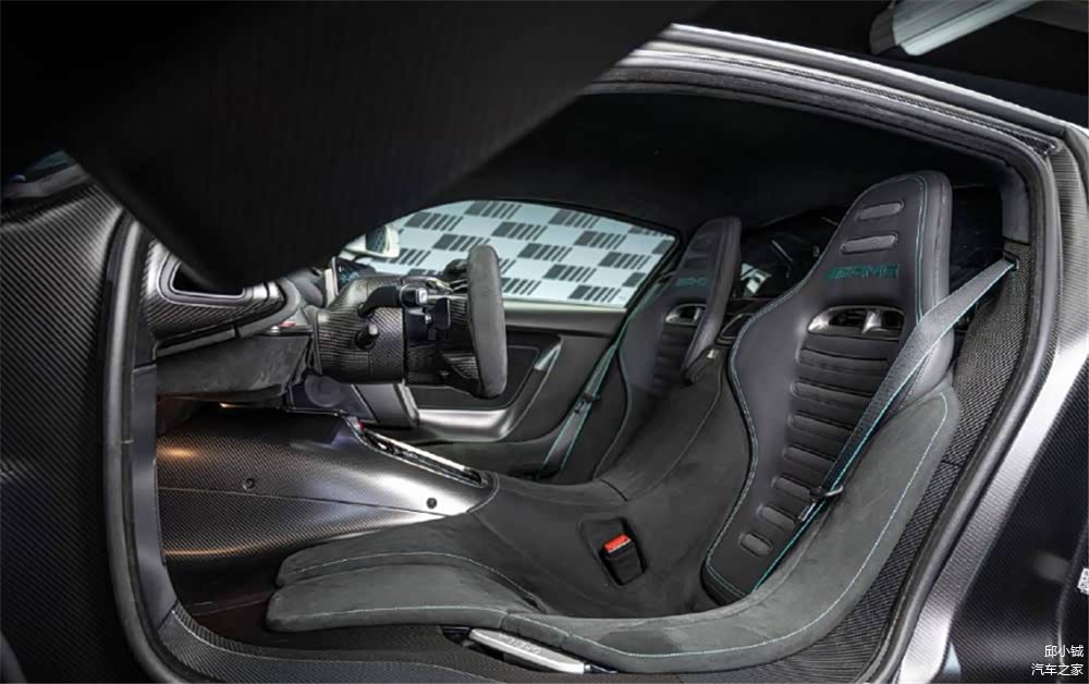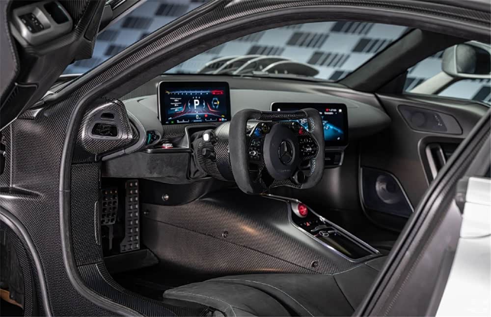 AMG ONE搭载的是源自F1赛用引擎的1.6T V6发动机,配合4个电动机组成插电式混动系统,综合功率达782千瓦(1063马力)。其车身质量不到1.7吨,百公里加速仅需2.9秒,11秒内可以加速到300km/h,最高时速超350km/h,是真的可以和高铁赛跑了。