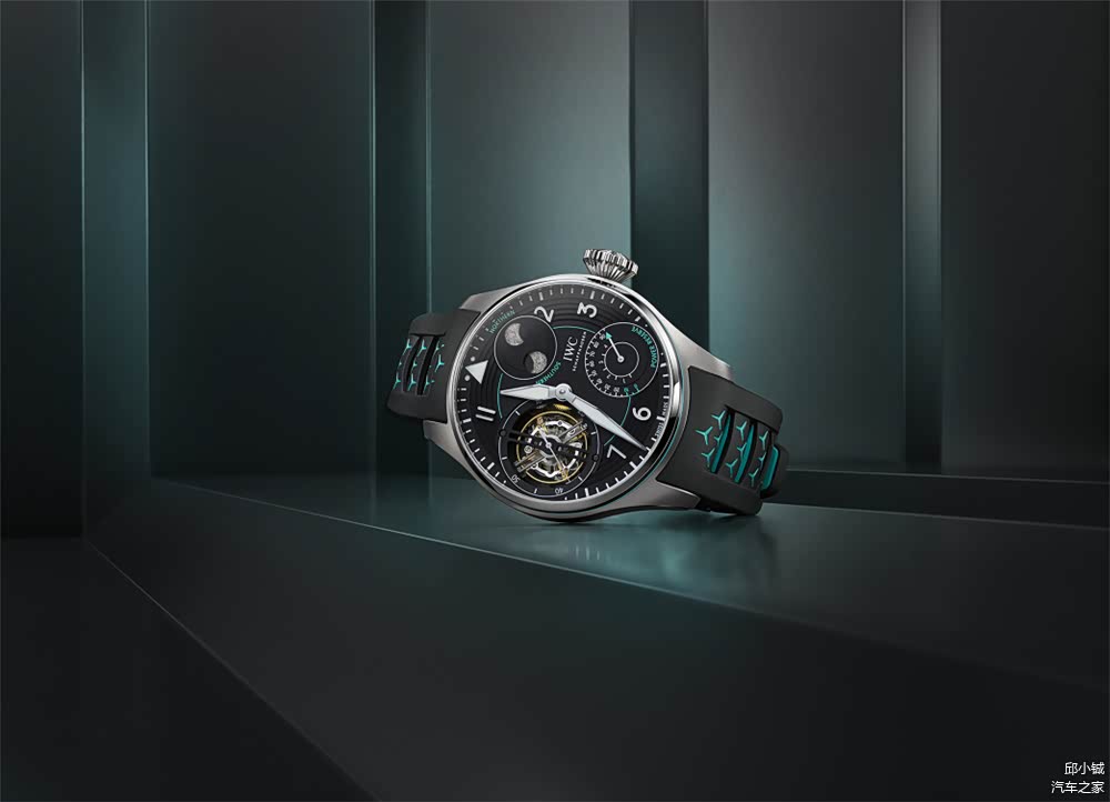这款专为AMG ONE车主打造的IWC大型飞行员恒定动力陀飞轮腕表“AMG ONE”车主专享版(型号:IW590502),在很多细节设计上可以让人联想到赛车激情。比如4点钟位置的动力储备显示,和汽车仪表上的转速表颇为相似;表盘外圈设有百叶窗式环形设计,灵感来自梅赛德斯-AMG ONE前部的进气口。黑色表盘的9点钟位置是可以观赏的恒定动力陀飞轮,1点钟位置设有南、北半球的双月相显示。