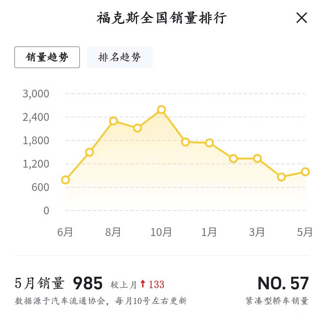福克斯在5月份的销量仅为985辆,位居紧凑型车销量排行榜第57名。近一年中,最高的销量也只是去年10月份的2580辆,甚至还不及一些热门车型的零头,只能靠着大幅优惠来吸引消费者。作为福特在国内市场曾经的销量主力车型,落到如今这个局面,和其全系仅提供三缸发动机有很大关系。