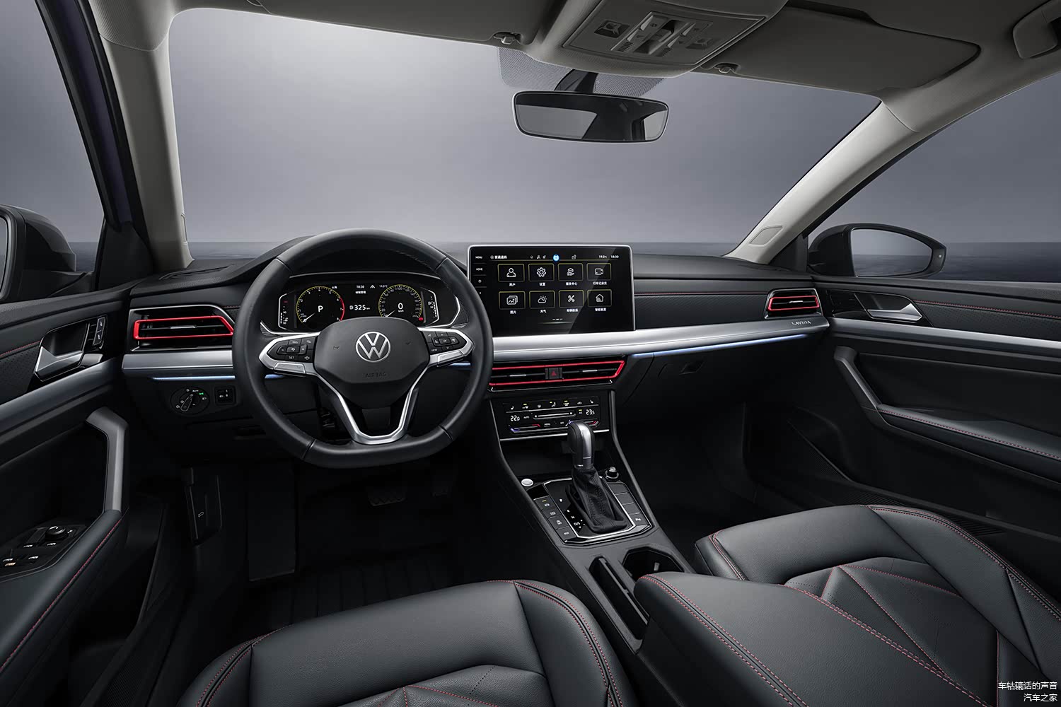 内饰设计上,新朗逸使用横向双色饰板贯穿整个仪表台,视觉上将中控台分割为上下两部分,中控屏由原来的嵌入式改为大众品牌最新的悬浮式设计,全新的家族式方向盘,空调出风口、仪表盘、门板等处,均采用炫银质感的镀铬加以修饰。酷感黑则为运动版车型独有的配色方案,采用大面积石墨黑色高级皮革面料,并在空调出风口,座椅缝线和扶手处使用红色作为点缀。