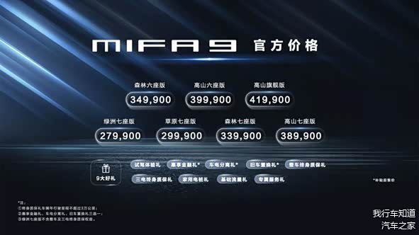 MIFA 9为全球首款全尺寸智能豪华纯电MPV,也是上汽大通MAXUS最新发布的旗舰产品,售价27.99万-41.99万元。整体造型采用了未来极简的设计语言,车头上方为贯穿式灯组设计,熏黑的梯形“假进气口”减少了车头的沉闷感。整车尺寸为5270mm*2000mm*1840mm,与同级车型相比基本属于块头最大的一个,这也为其带来了极为优秀的座舱空间。车内最大的亮点便是超10块的屏幕数量以及VVIP级别体验的二排座椅,车内10块屏幕带来极强的科技感和豪华感,提供了不俗的娱乐能力。而VVIP级别的二排座椅则是MPV届的天花板,舒适体验远超航空级别。