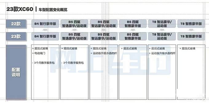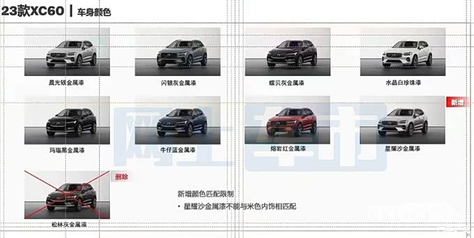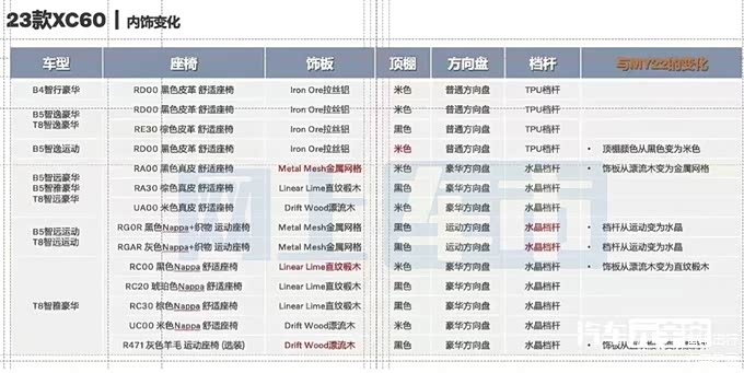 新XC60配置上全系升级层压式玻璃(双层夹胶玻璃),入门的B4智行豪华版还增加了电动尾门,但是B4智行和B5智逸系列取消了3个月数字服务包,B5智远运动版升级了水晶电子挡杆。其他方面,新车新增星耀沙金属漆,取消了现款的松林灰金属漆,增加4种款式轮毂。