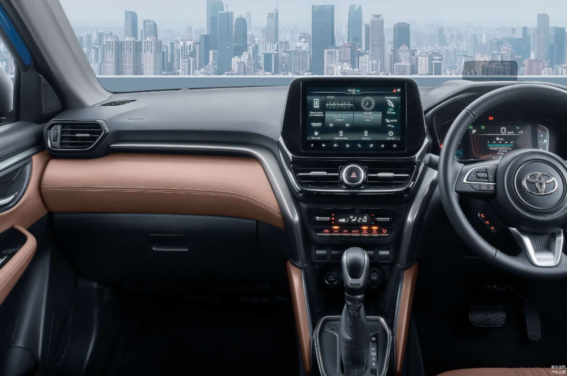 丰田Urban Cruiser Hyryder采用双色内饰,棕色和黑色拼接,仪表台上有一个9英寸触摸屏和一个7英寸数字仪表盘。铃木的驾驶模式选择开关也出现在中控台上。仪表台和车门采用了软件材质包裹,增加了档次感,棕色色调与双色皮革软垫座椅相匹配。