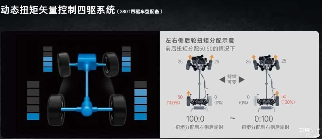 DTV动态矢量四驱特点是左右后轮扭矩可以在0:100-100:0之间变换,具备出色的过弯性能和操控稳定性能。