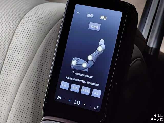 而且中央扶手还集成了一个小屏幕——准确来说是小车机,可以电动控制座椅、灯光、空调、冰箱、媒体等等。