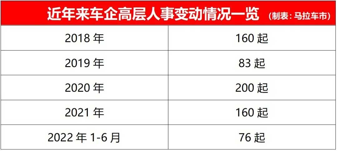 据马拉车市不完全统计,在今年1-6月的181天时间里,车企高层人事变动已超76起,平均不到三天的时间就会发生一起。