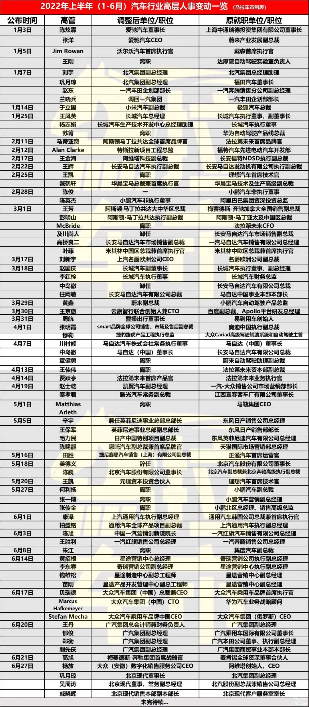 2022年上半年已然完结,马拉车市通过查询车企相关公告,整理、汇总出了2022年上半年汽车行业内的高层人事变动消息。