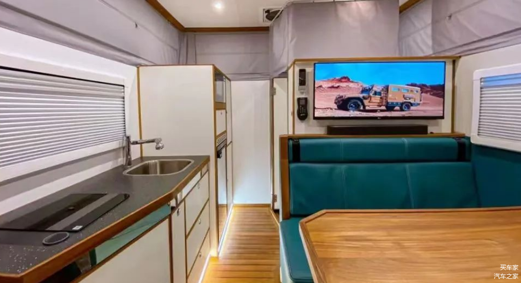 车外是粗犷的野性美,车内则是细腻的居家布局,有限的车内空间拥有一客一卫一厅两厨,并配备有空调、洗衣机、柴油火炉等装备,日用配置十分齐全。对坐沙发还可以变成1900mm×1200mm的豪华大床,满足休息睡眠。