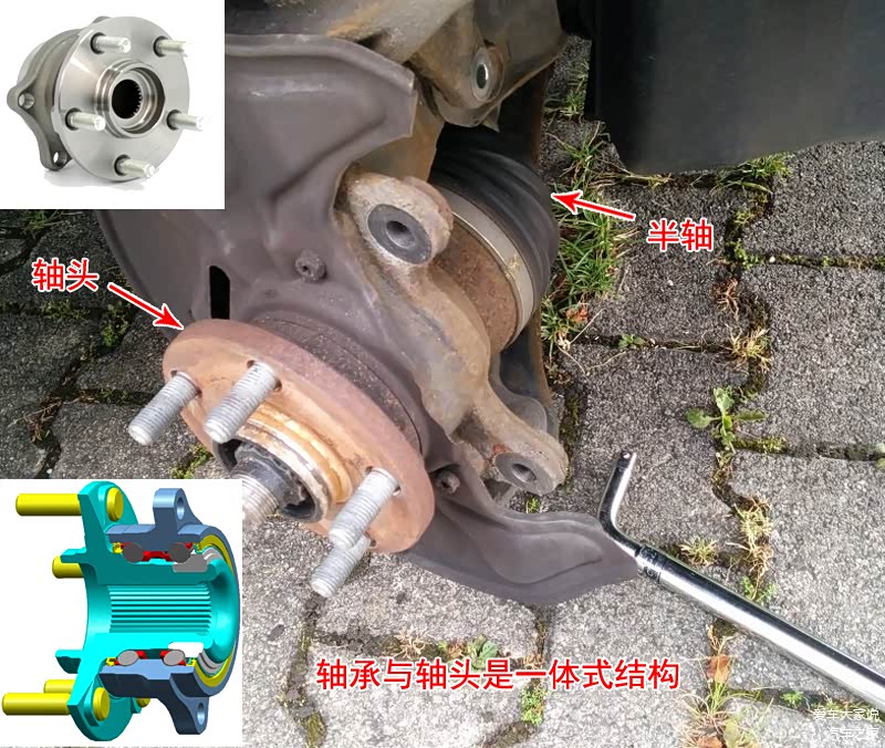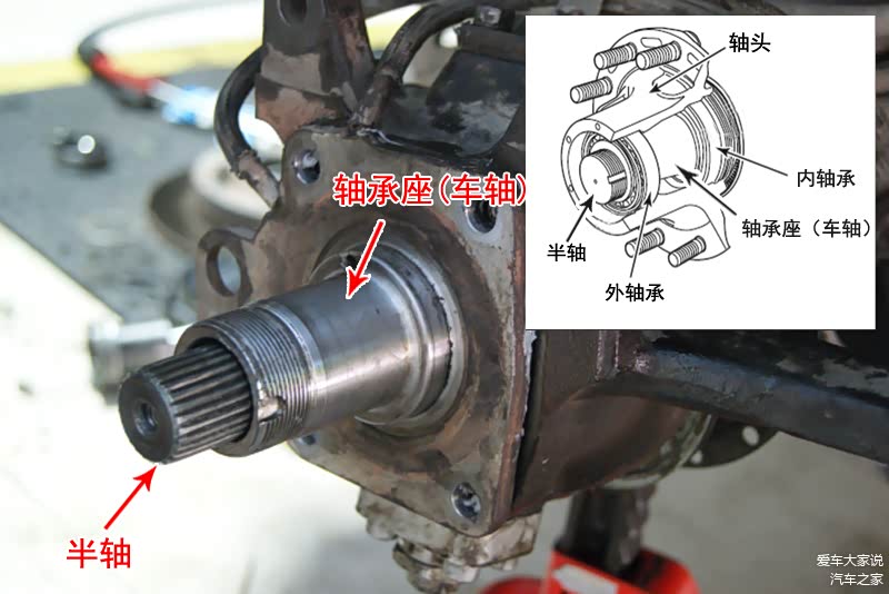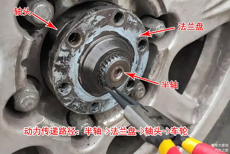 比如上图就是一个实物图,轴头通过轴承套在车轴上,半轴从车轴中间穿过来通过法兰盘与轴头连接传递动力,车轮再安装到轴头上,这样半轴的动力就传递给车轮了。