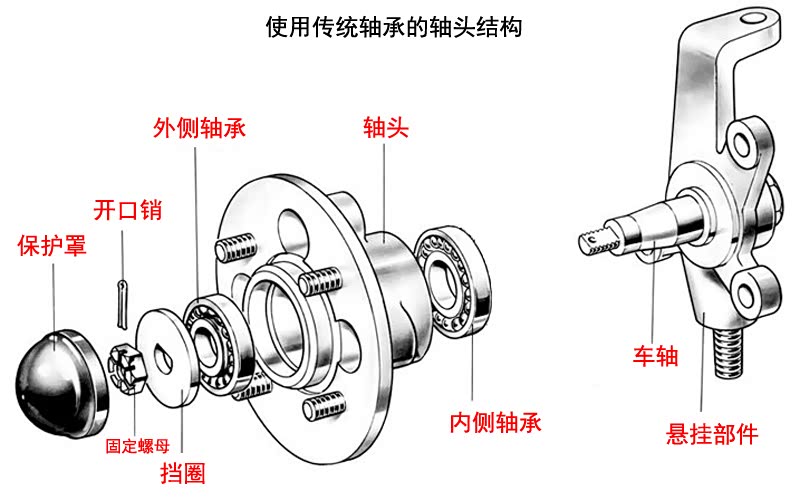 早期车辆使用的是第一代车轮轴承结构,就是用独立的轴承把轴头与车轴连起来,然后车轮再安装在轴头上。这种结构对于驱动轮来说半轴就只能从车轴里穿过来,然后通过一个法兰盘与轴头连接来传递动力。