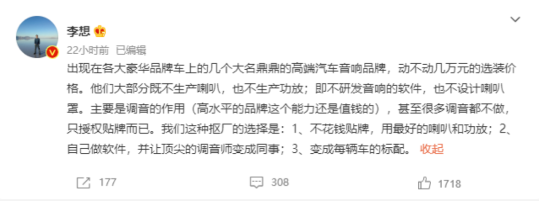 业内著名的“大嘴巴”李想也跟进了此事,他在7月8日发了一条微博,说动辄几万的高端选装音响,其实品牌方既不生产喇叭,也不生产功放,只是授权贴个牌。