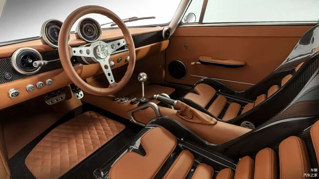 车身为碳纤维制造,内饰有漂亮的碳纤维座椅,也有彰显年代感的皮革和木制品,一对满是Giulia GT回忆的圆形仪表盘里镶嵌的却是两块液晶屏,精致到无与伦比。