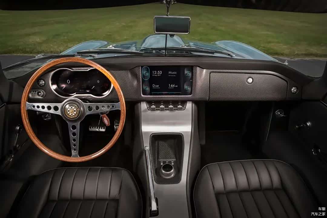 Jaguar Classic的工程师还未E-Type Zero设计了新的内饰,主要体现在一些现代科技元素的加入,包括数字仪表盘、触摸中控屏、旋钮换档、驾驶模式切换、座椅加热通风等功能。单纯看这些东西肯定跟E-Type不搭,但结合Zero主题来看并不算太违和。