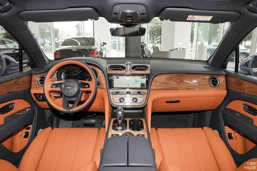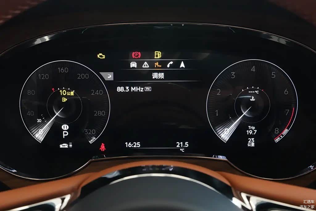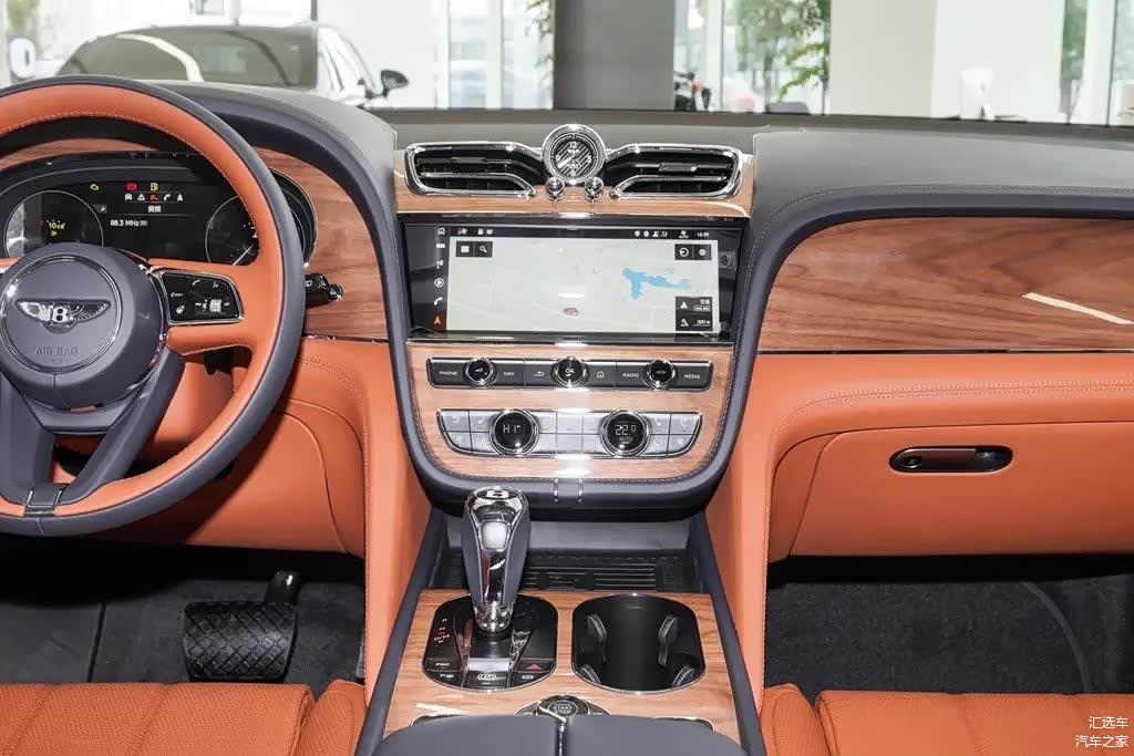 本次解读的车型内饰采用Newmarket Tan/Brunel配色,豪华档次象征的实木饰板也点缀其中,营造出较为浓郁的奢华高级氛围。类似飞翼样式的中控布局,对此估计大家都不陌生了,虽然不会给我们带来什么设计新意,但当我们真正坐在宾利添越实车的时候,就会发现它独特的魅力所在。基本上我们用手能触摸到的地方,均加入了顶级真皮材质进行包裹。并且为了顺应发展的潮流,满足当下消费者的审美需求,宾利添越还配备了全液晶仪表盘,显示效果较为细腻,界面设计也比较有前卫科技感可言。除此之外,宾利添越支持选装夜视系统。