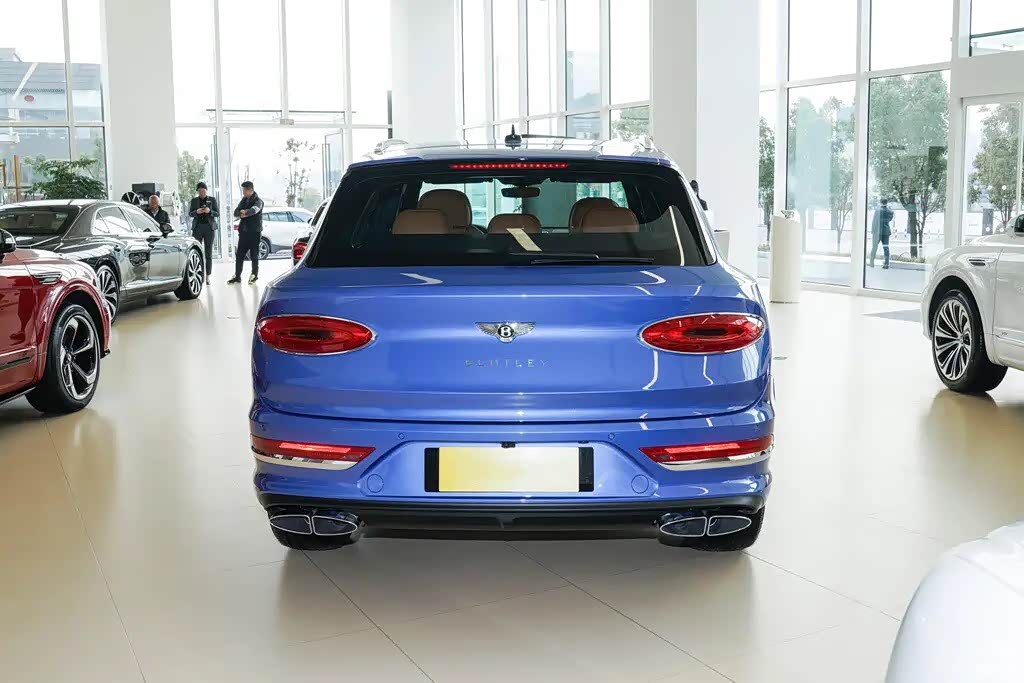 转身来到车尾部分,同样有着较高的宾利辨识度。经典的椭圆形尾灯造型,和前脸设计起到了良好的呼应效果。镶嵌在车顶位置的扰流板以及下包围处的双边共四出排气,也让这款宾利添越有着不凡的气质和颜值。