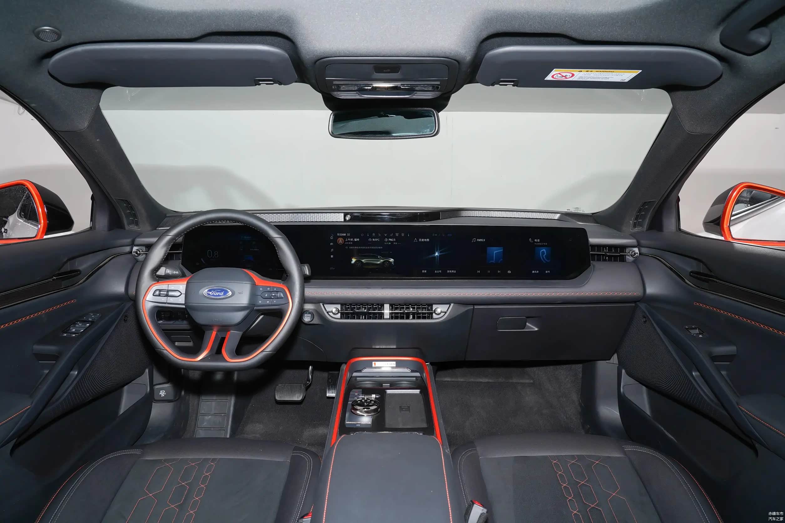 内饰方面更接近新能源汽车的设计理念,采用贯穿式大屏幕,几乎占据了整个中控台,屏幕尺寸非常大,分辨率都很高,显示的功能非常全面,在同级车型中达到了领先水平。三幅多功能方向盘的握感很不错,两侧的多功能按键也很好用,并且也加入了橙色的饰条,为黑色的内饰增添活力。福特EVOS采用电子旋钮式换挡,看起来很高级,车内的乘坐空间也比较宽敞,毕竟车身尺寸很大,所以第二排的腿部空间的有了明显的提升。