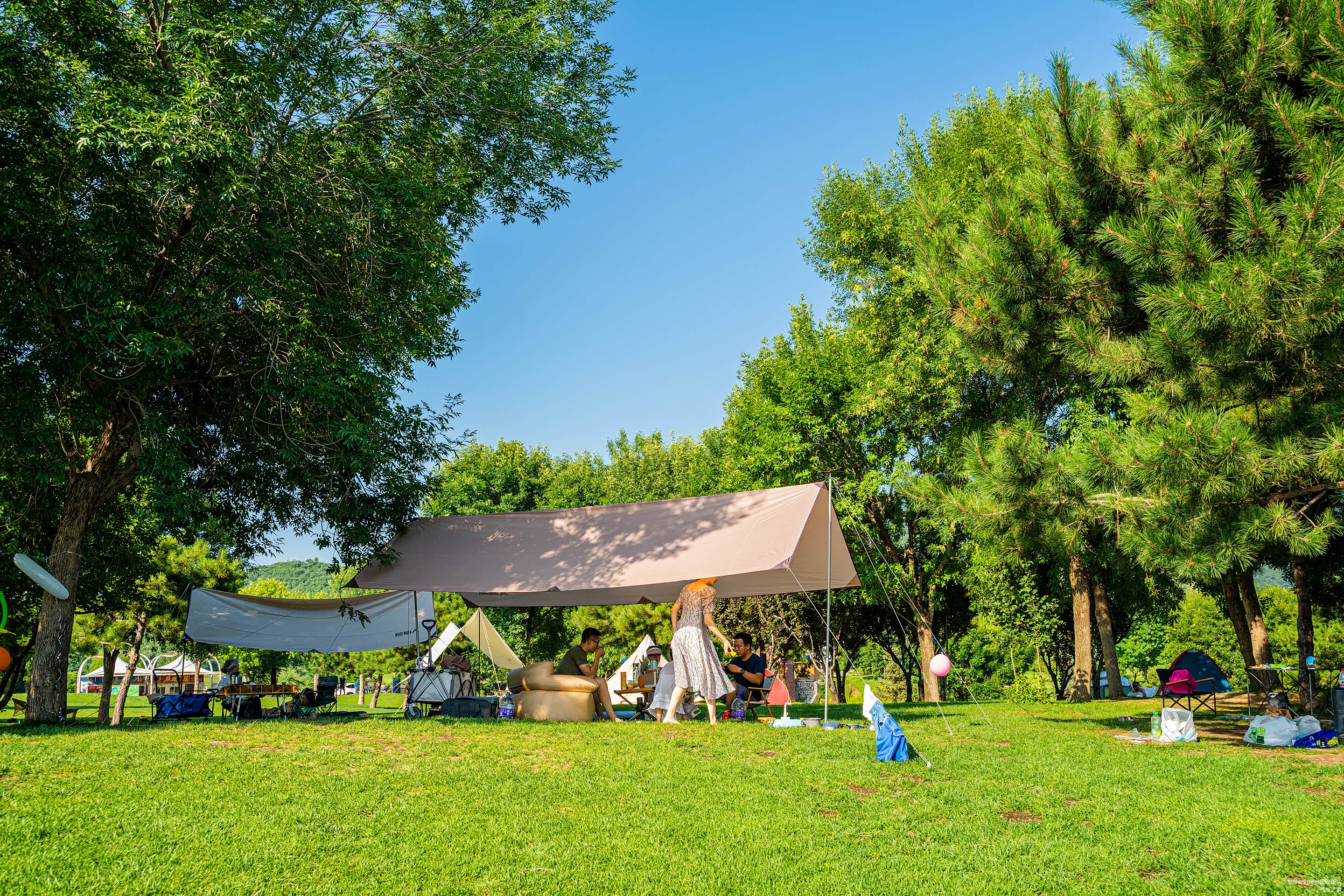 最近北京的天气炎热,中午到达这里,开始扎营,弄帐篷和天幕那是相当的耗费体力,如果不是过夜,可以简单的搭一个天幕即可。这里提供露营装备租赁服务,天幕、椅子、烧烤炉等等都有,露营可以过夜。