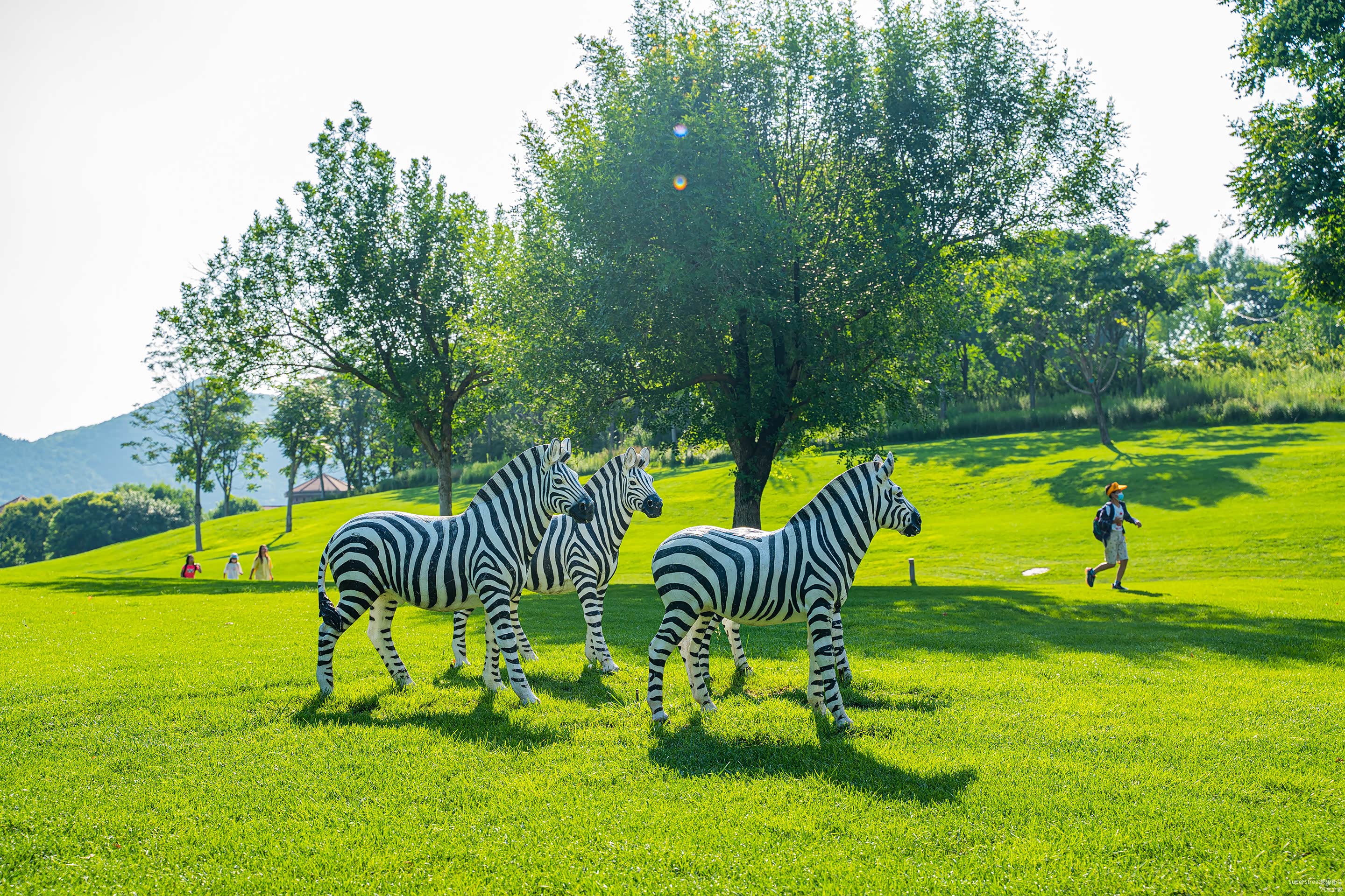 岛上还有别墅区域,车辆也不能行驶,属于比较隐私的区域,这里的草坪维护的很好,还有一些动物雕塑可以活跃气氛。可以见到天鹅、斑马、熊猫这些动物雕塑。