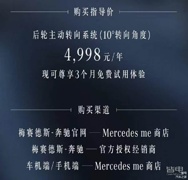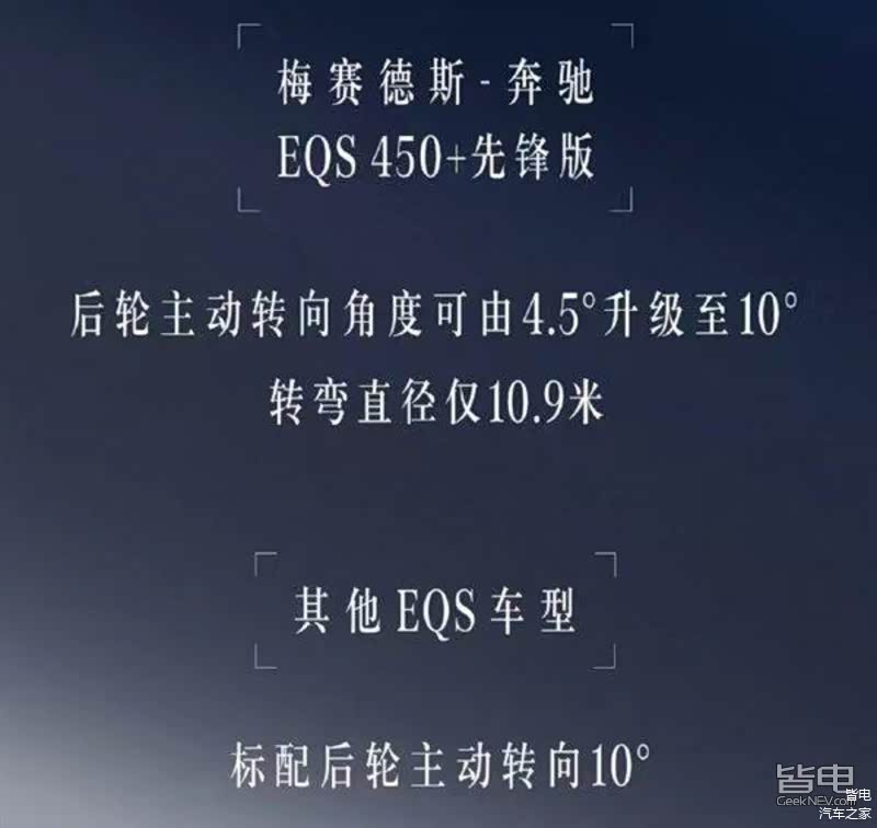 就在前不久的一天里,奔驰低调地推出了一项服务——“后轮转向角度升级服务”,就是EQS450+先锋版车型用户可以通过付费升级的方式,将原先4.5°的后轮转向角度升级为10°,升级后转弯半径可以降至10.9米,费用为每年4998元/年。(PS:其他EQS版本车型标配10°后轮转向)