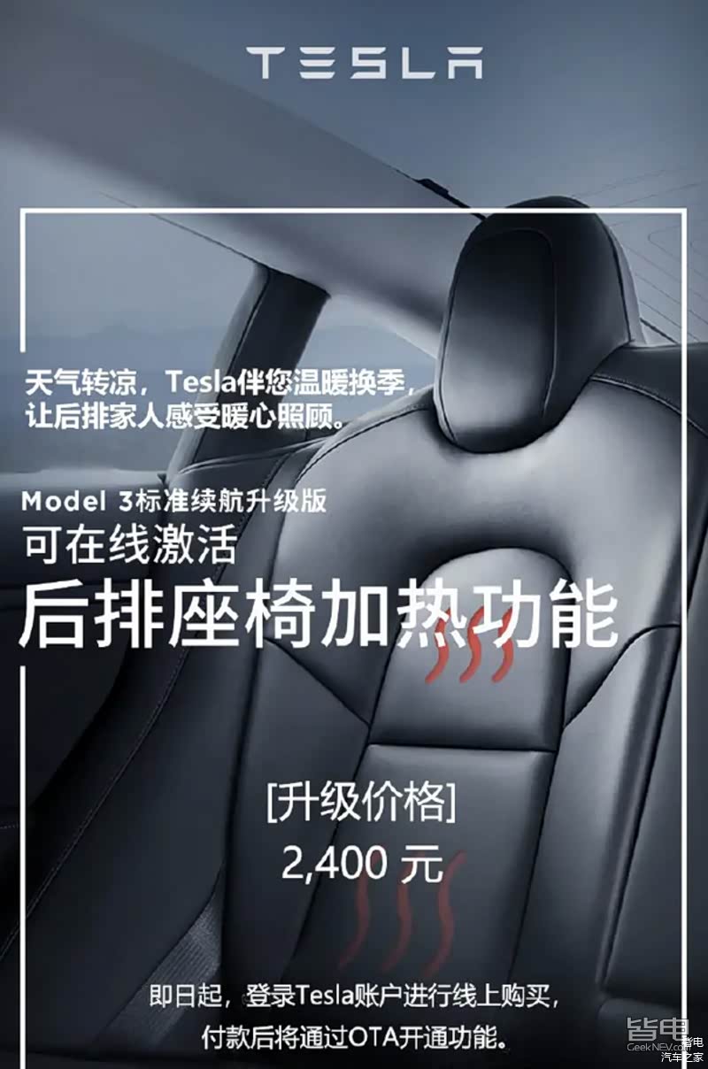 其实早在2020年年初大雪纷飞之际,特斯拉就开始玩起了付费订阅,Model 3标准续航升级版的用户可以付费2400元升级后排座椅加热功能,要知道距离该版本的Model 3上市已有相当长的时间,也就是说,这一套硬件,包括发热丝,电路等在车型交付的时候就已经给你埋起来了,竟然还能在寒冷的冬季想起来给你那么一丝“惊喜”。