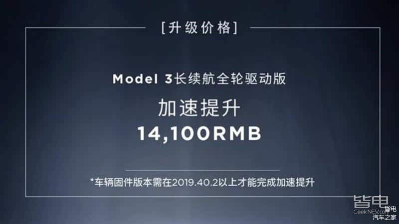 除了这些“小打小闹”的升级以外,特斯拉其实还针对性能推出过加速提升升级,特斯拉曾为特斯拉Model 3长续航全轮驱动版本推出了付费升级加速功能,在线付费1.41万元后,厂家可以云端提车辆升级,将4.6s的百公里加速时间升级至4.1s。