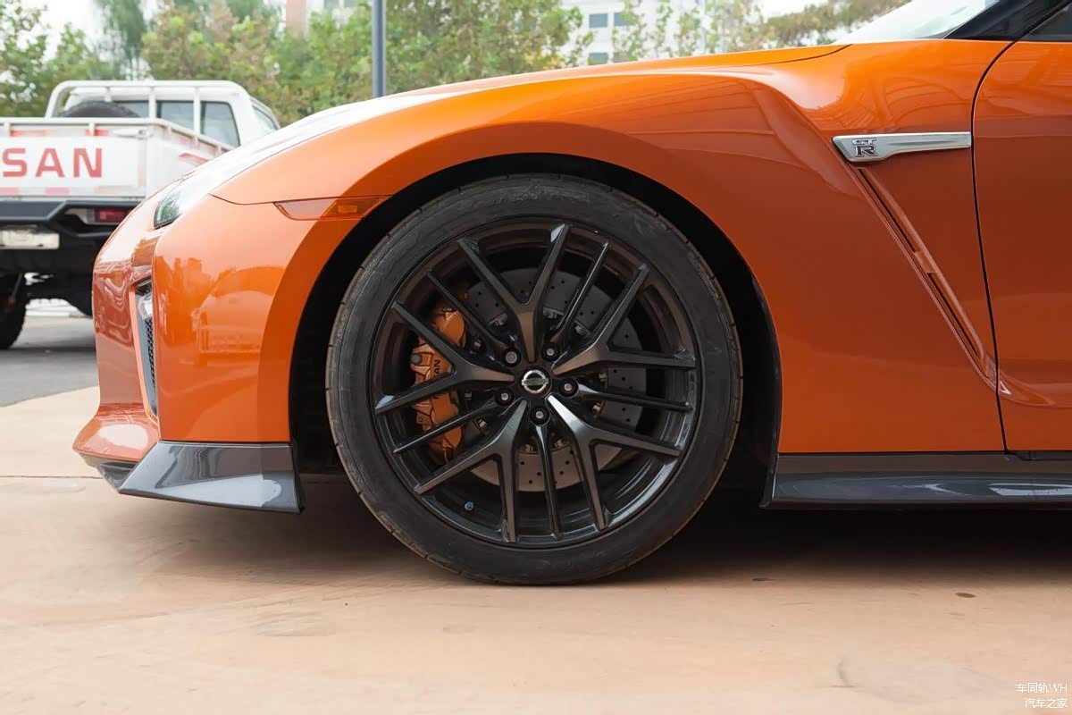 车身侧面,映入眼帘的不是流线型的车体,而是前翼子板处突出的设计还有连接的亮银色GTR标志,Y字型轮毂搭配与车漆相同颜色的卡钳,这些配置都给这辆“战神”增添了许多帅气的色彩,而看到这辆车车门后的闪电型的走线也独具一格。