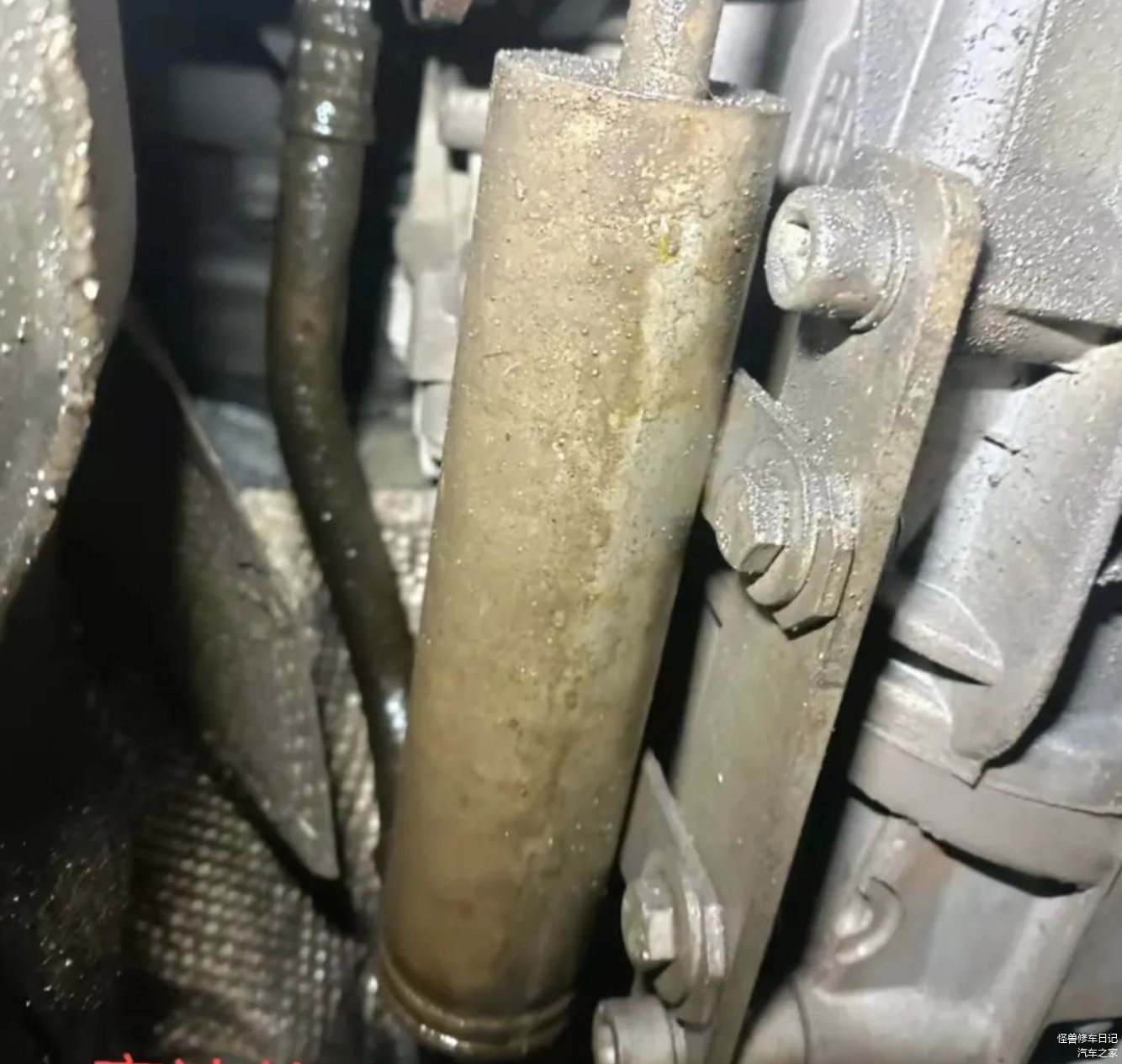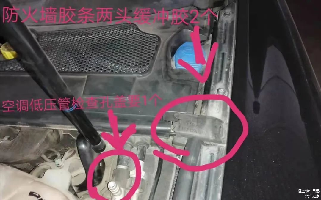 防火墙缓冲胶条老化破裂,空调低压管缺个孔帽。