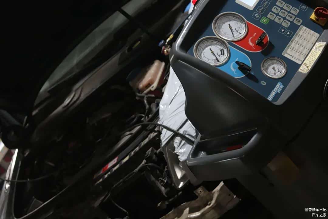 空调不冷,检查冷凝器有沙眼渗漏了,更换原厂件。