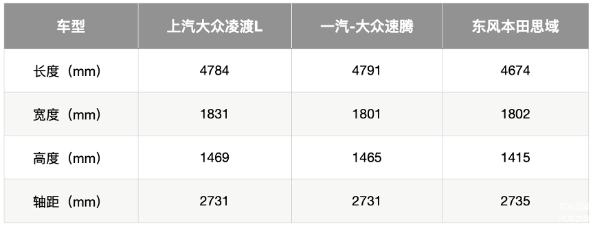 从车身尺寸数据的对比来看,三款车型的轴距长度几乎相当,因此在消费者重视的后排腿部空间与乘坐舒适性层面,它们的纵向空间可以说在伯仲之间,不过凌渡L因为有1831mm的车身宽度加持,让它在实际用车时获得了比速腾、思域更加充裕的横向车内空间。