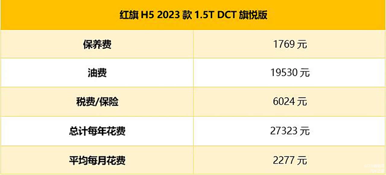 关于年度总费用支出这部分,我们按照每年行驶2万公里的里程、油耗参考车主口碑油耗的平均值10.5L/100KM(油价参考近期上海地区95号汽油油价为9.3元/L)、保险缴纳车损险与第三者责任险100万再加不计免赔的计算方式。以及加上未出险情况下,保费第二年8折,第三年7折,取三年保费的平均值,这些条件一并来计算全新红旗H5每年的用车成本总计为27323元,平均每月花费为2277元。具体如以下表格: