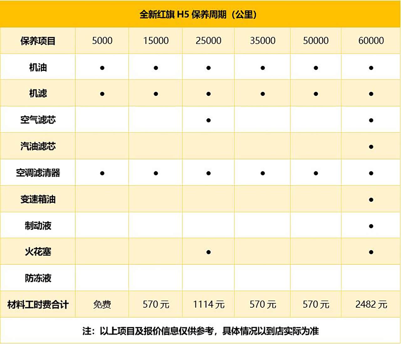 根据相关购车政策,目前购买全新红旗H5,是可以赠送4年10万公里的免费基础保养的。也就是说,如果每年的行驶里程控制在20000公里以内的话,新车头4年的基础保养这块是不需要自己掏钱的,只需要自费对其他的易耗件在相应公里数时进行更换。这对于车主而言,确实可以省下不少钱。不过,为了让车主了解这款车大概的用车成本,我们抛开这些免费保养政策不谈,看看红旗H5的保养成本是否还足够“亲民”?