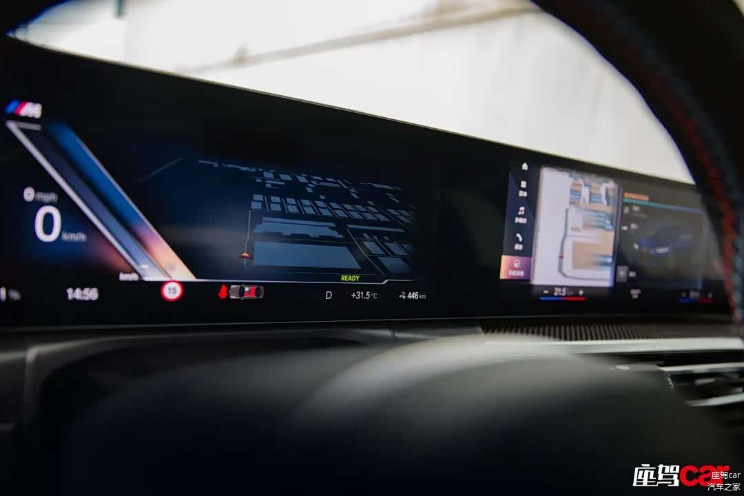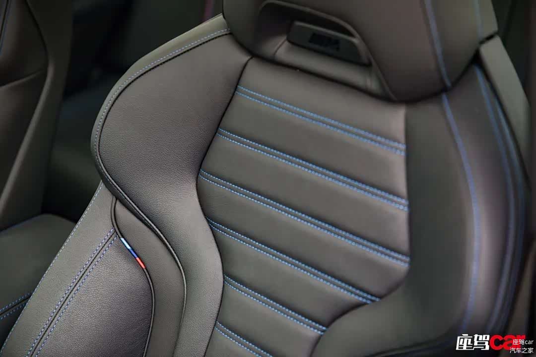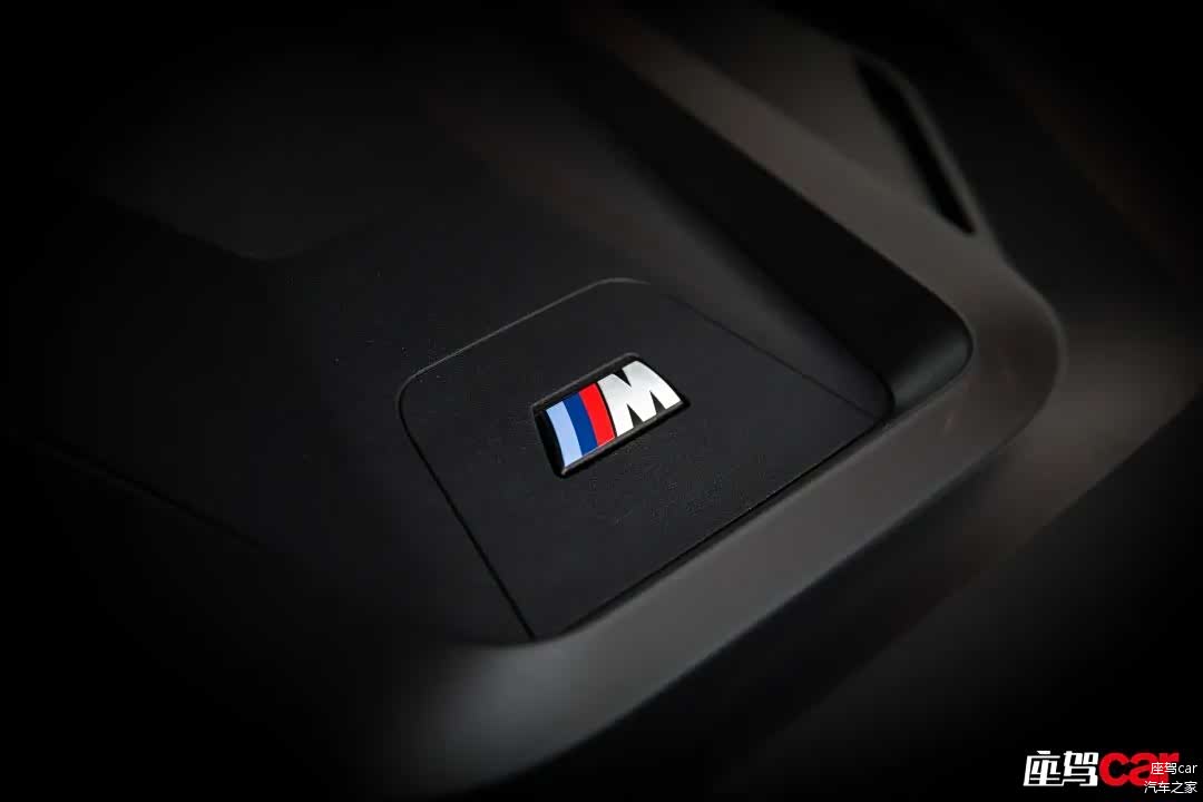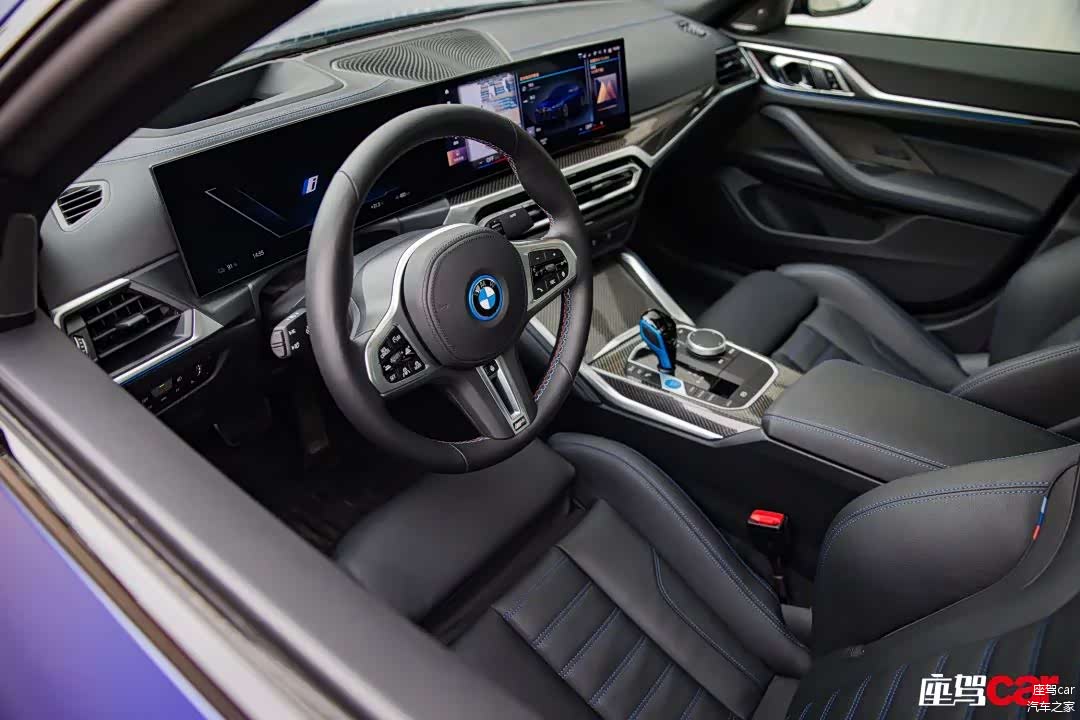 好了,说说不同的地方。首先是仪表台及挡把区域大面积的碳纤维材质覆盖,与国产i3及i4 eDrive40的铝制饰板完全不同,当然在i4 M50上它也不是标配,而是需要你额外付出5000元的成本,在我看来依然是物有所值,M就要有M的氛围,这毋庸置疑。其次,就是M运动型多功能真皮方向盘上的M三色缝线,它会给驾驶员带来一种时刻将激情握在手中的感觉。再次,i4 M50标配带有M徽标(可惜无自发光)的桶形运动座椅,它也是i3、i4中唯一标配了Vernasca真皮的座椅,座椅有着出色的包裹性并提供大腿支撑以及电动侧翼调节,让你的身体无论处于多么激烈的驾驶状态下都会被牢牢固定其中,只是相比于国产i3而言,并非“中国独有”的这款M座椅填充物相对较硬,更偏重于运动驾控所需。另外,i4 M50还可让你用2900元选装前排M三色条纹安全带。届时,手中所握、身上所系全部被三色包围,我想每位准车主都不会拒绝这样的诱惑。最后,也是最为显眼的部分,i4 M50依然采用上一代智能互联驾驶座舱配套的小型电子挡杆,并覆盖以几乎半包的蓝色装饰凸显纯电动身份。而在如今最新的宝马座舱中,挡把已经被小巧的电子拨杆所取代,我们无法评价优劣,我想每个人都会有自己不同的喜好。