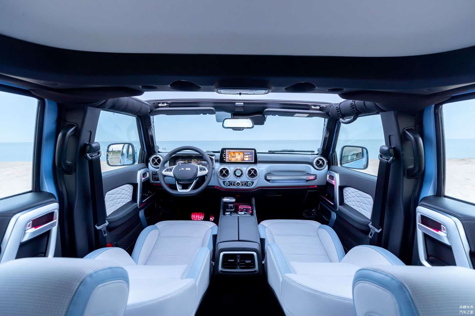 全新北京BJ40城市猎人版作为年度改款车型,在内饰方面的变化还是比较明显的,车内海风蓝色皮革包裹,营造出浪漫温馨的感觉,同时在配置方面也进行了全面升级,三幅多功能方向盘的握感很出色,两侧的多功能按键分布合理,都是一些常用的功能,在开车的时候操作非常方便。12.3英寸全液晶仪表为整车提升科技感,显示效果很不错,车辆信息以及导航信息等都是可以在全液晶仪表上显示的。中控部分搭载一块10.25英寸的悬浮式大屏幕,配合仪表台的布局,有一种奔驰大G的既视感,看起来很豪华。