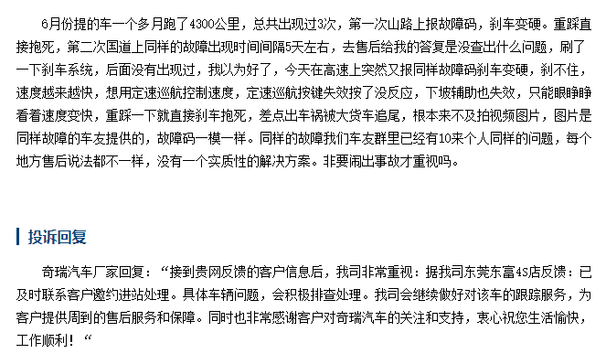 其实蜂鸣声的问题还不是最致命的,有不少车主甚至表示,自己的瑞虎8 Pro频繁出现刹车变硬、刹车失灵等问题。问题表现为行驶过程中刹车变硬,车辆刹不住,并且仪表盘上故障码全亮。而且同样的问题不少车主都碰到过,车主表示,自己所在的车友群就已经有10来人遇到过同样的问题,关键是找到4S店售后也没有一个实质性的解决方案,现在自己都不敢开这个车了,实在太危险。