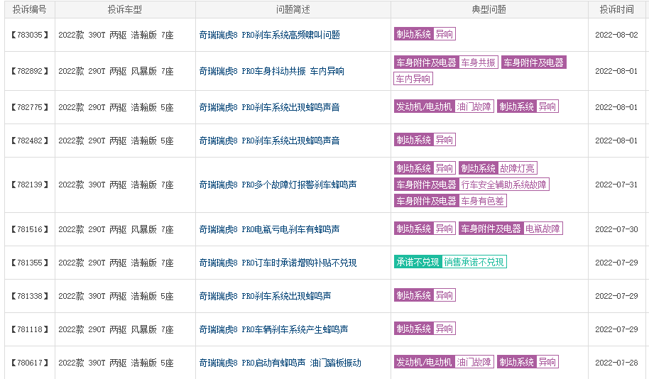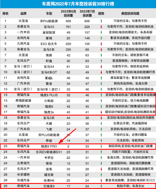 根据车质网刚刚公布的7月份汽车投诉榜单显示,奇瑞集团共有6款车型进入投诉榜单,且都排名靠前。更让人值得注意的是,刚上市两个多月的奇瑞瑞虎8 Pro投诉量环比暴涨15.5倍,也冲进了投诉榜单。根据探长从事汽车投诉多年的经验来看,一款刚上市的新车投诉量突然激增,要么就是存在设计缺陷,要么就是销售阶段出现了问题,那么奇瑞瑞虎8 Pro的问题到底出在了哪里呢?
