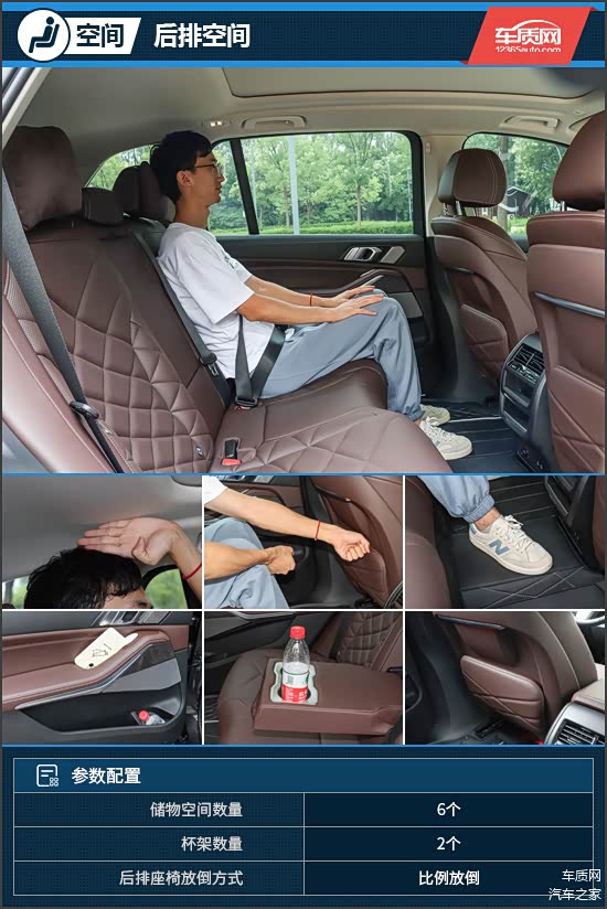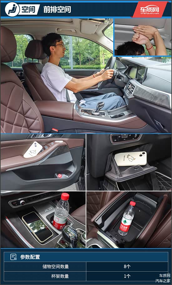 华晨宝马X5前排乘坐空间表现与进口版一致,身高为178cm的体验者进入前排,调整好坐姿后,头部拥有一拳四指距离,表现可观。储物空间方面,国产版与进口版主要区别在挡把前方区域,新车由进口版两个杯架更改为一个杯架,不过左侧斜置的专属手机充电板很实用,且充电速度很快。