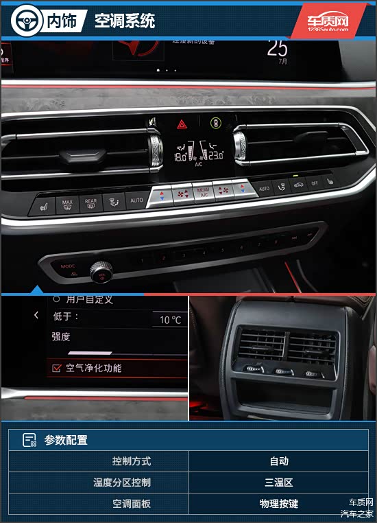空调方面,华晨宝马X5采用经典的物理按键设计,其中温度、风量等常用按键选用银色的金属按键设计,看上去更加精致。功能性方面,新车全系标配PM2.5过滤装置和负离子发生器,不过2.0T车型只提供后排独立空调功能的选装,价格为7600元,而3.0T车型则为标配,这一点不够厚道。