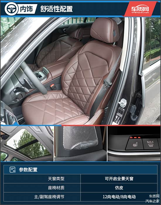 舒适性方面,华晨宝马X5与进口版一致,全景可开启全景天窗、座椅加热、哈曼卡顿音响、后排扶手等等均有所配备,不同的是,华晨宝马X5针对国内消费者体型,将座椅重新设计,其中前后排坐垫厚度增加15mm,后排座椅靠背倾角比进口版更大,增至31度,确保后排乘客在长途行驶中拥有更为舒适的坐姿。此外,新车座椅全系标配带“X5”字样印花的Sensafin软质合成皮,虽然没有采用真皮材质,但其柔软度和支撑性都表现相当出色。