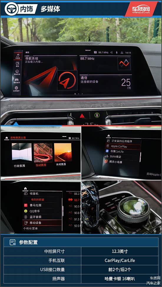 华晨宝马X5依旧配备12.3英寸悬浮式中控屏,内部搭载第七代BMW iDrive人机交互系统,该系统针对国内市场进行了很多调整,不仅支持CarPlay/CarLife互联,同时还提供多种app下载,以便迎合国内消费者使用需求。值得一提的是,相比于宝马3系、宝马X3等相较亲民的宝马车型外,华晨宝马X5在细节上更为考究,除配备水晶挡把外,右侧的多媒体控制旋钮也采用“水晶”材质,高档感油然而生。