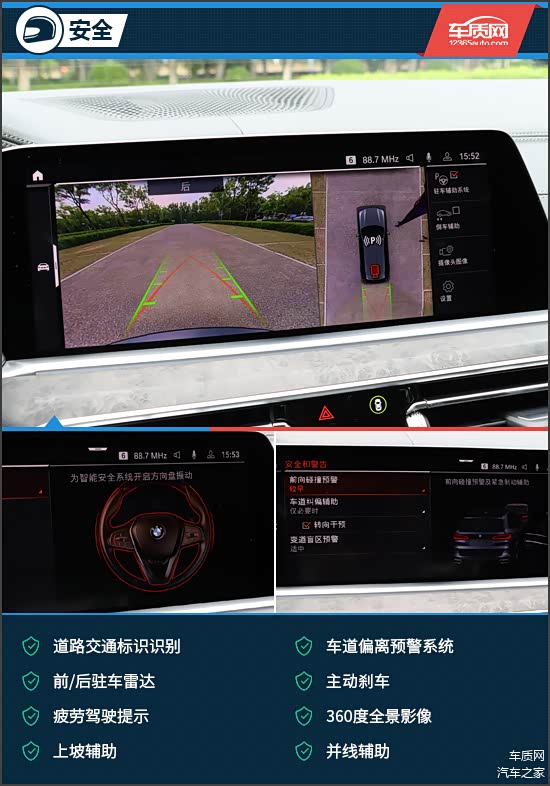 安全配置方面,华晨宝马X5可谓非常全面,道路交通标识识别、车道偏离、前/后驻车雷达、主动刹车、疲劳驾驶提示、360度全景影像、上坡辅助以及并线辅助等均有所配备。值得表扬的是,宝马家族的全景影像向来十分清晰,且无延迟无卡顿,使用起来非常省心。不过,车道保持辅助系统介入时候的幅度较大,会出现与驾驶员“抢夺”方向盘的情况。